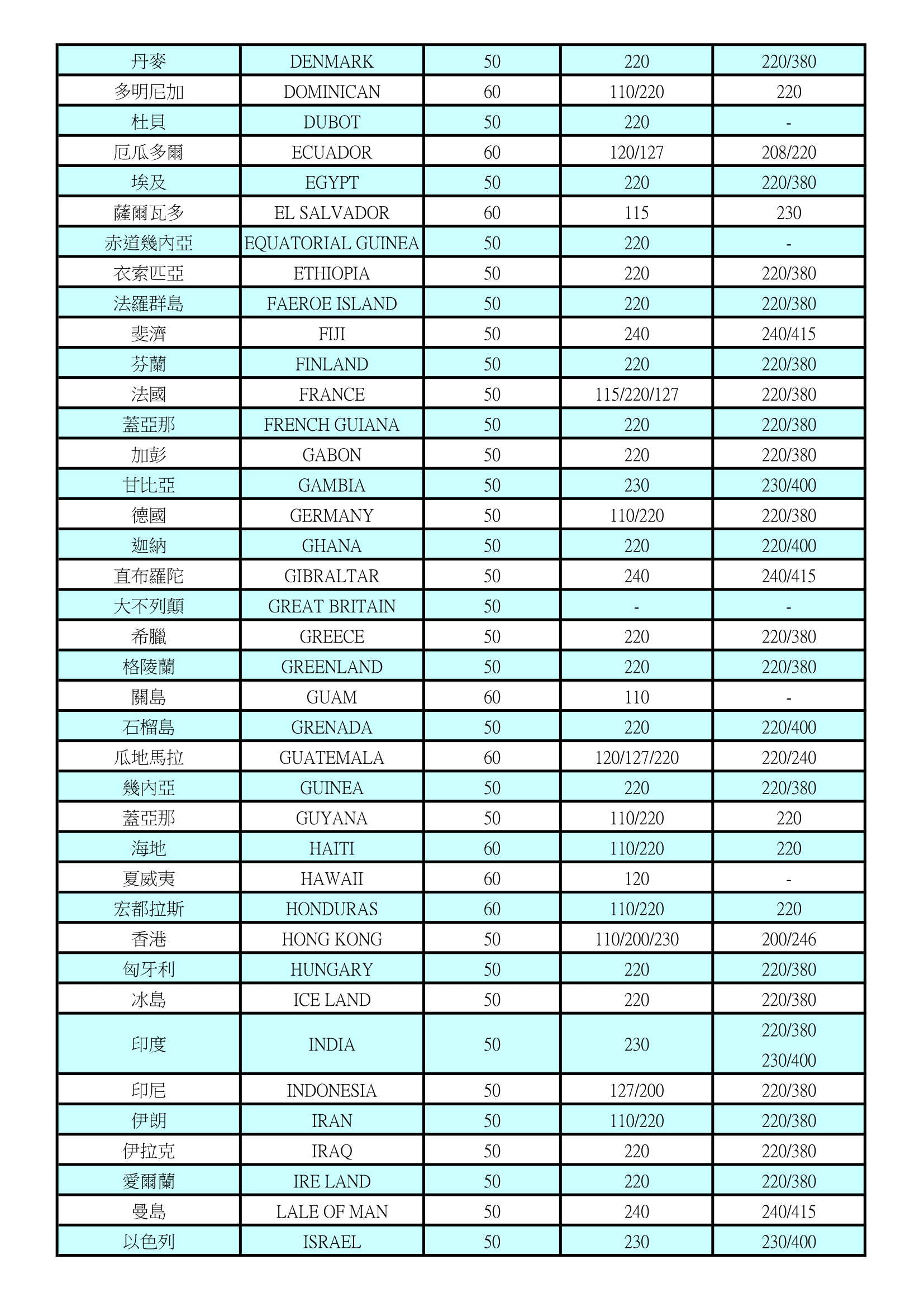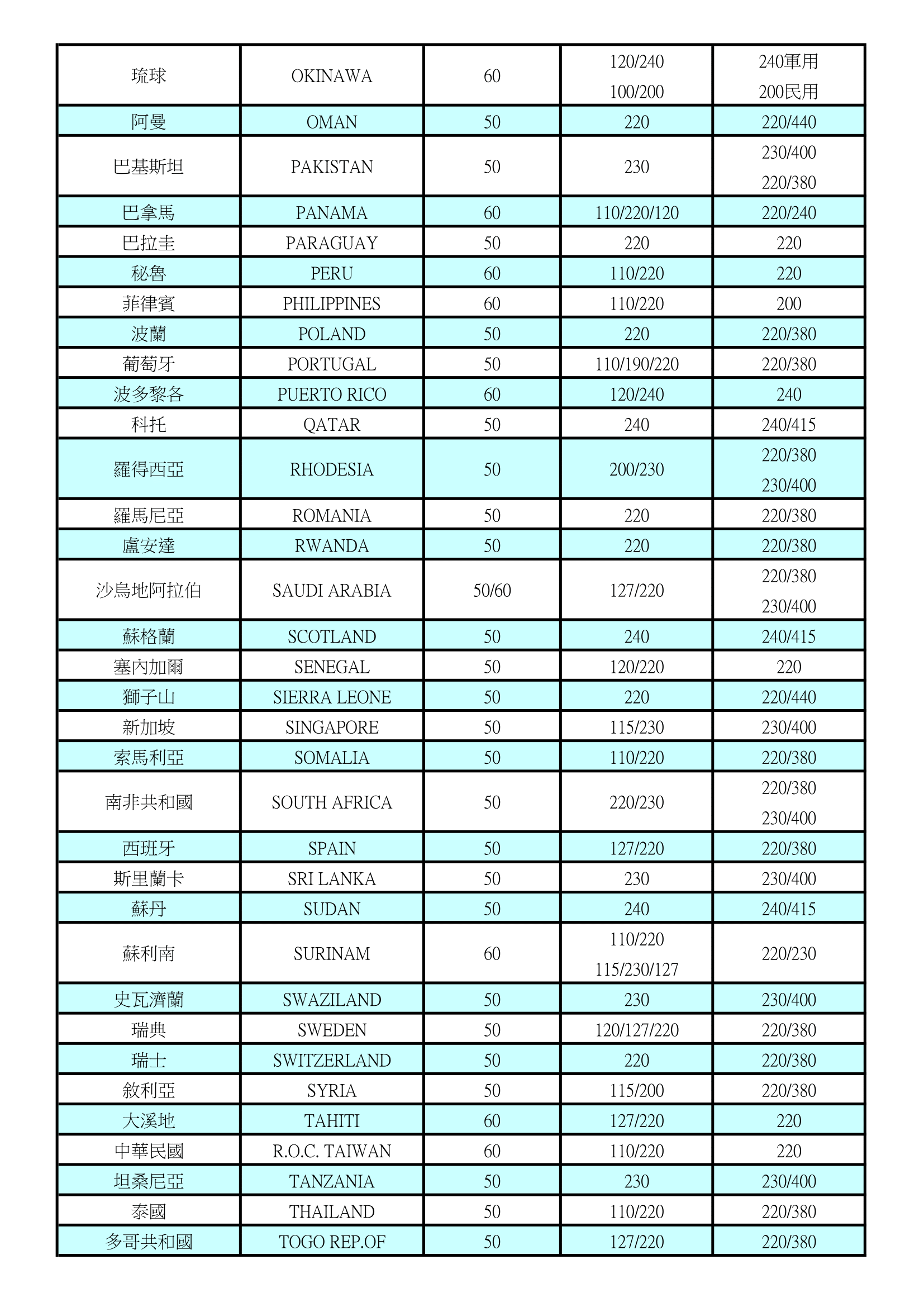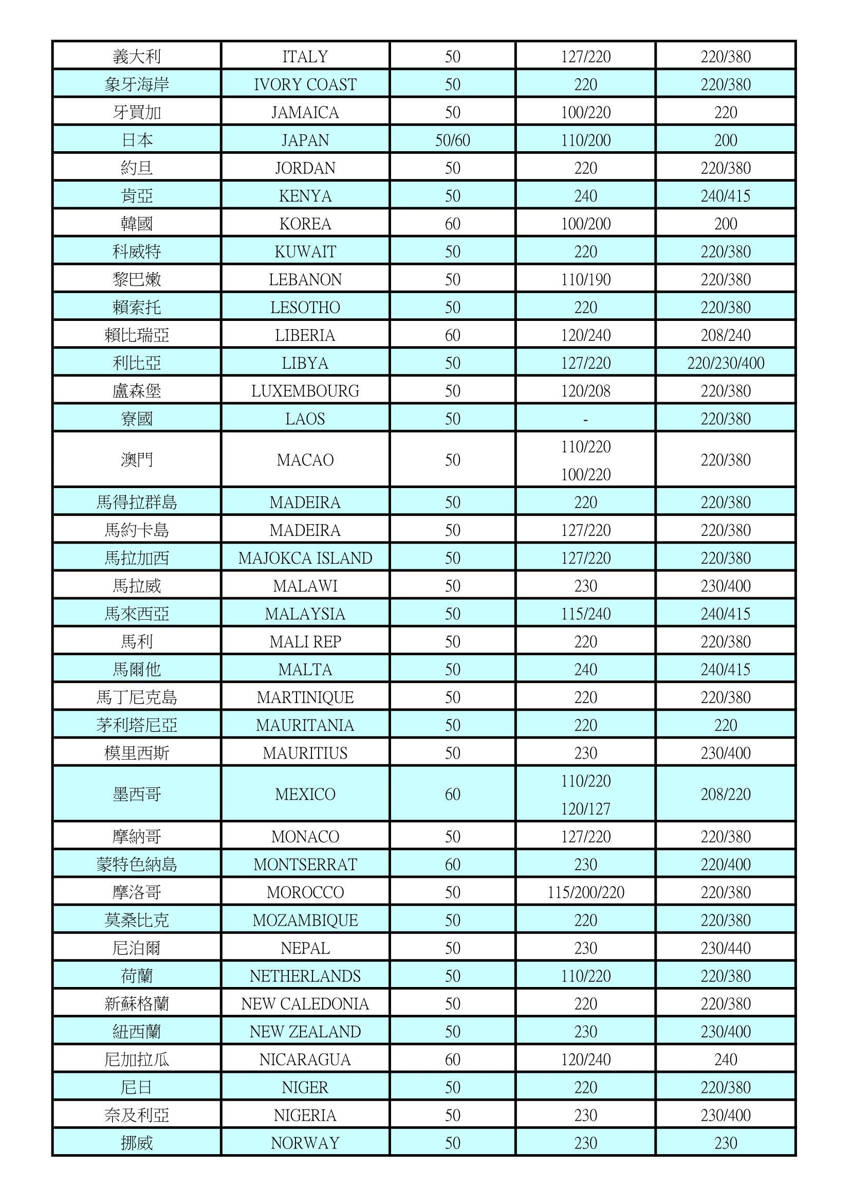世界各國電壓及週率表