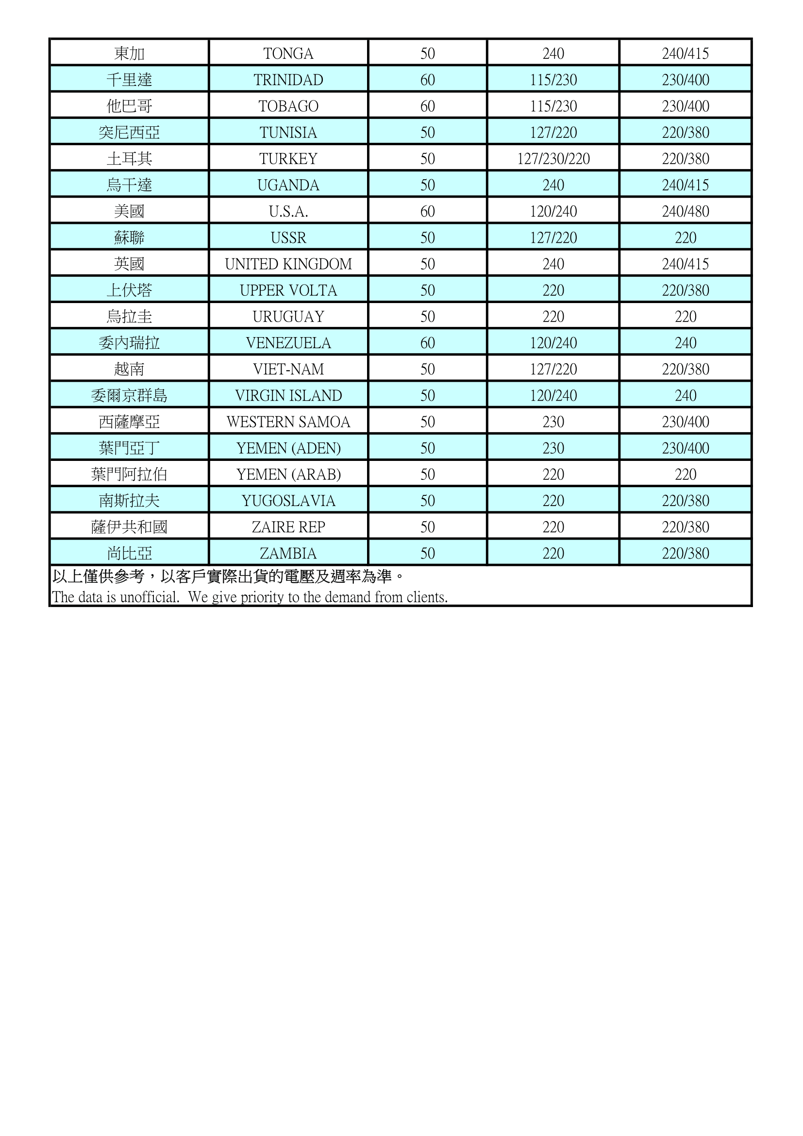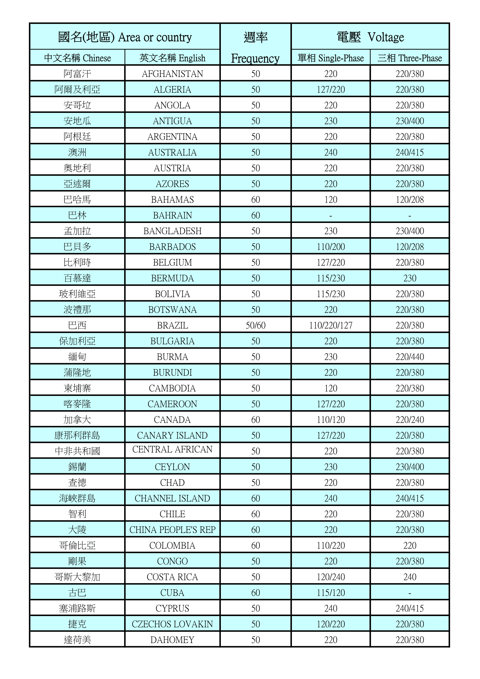 世界各國電壓及週率表